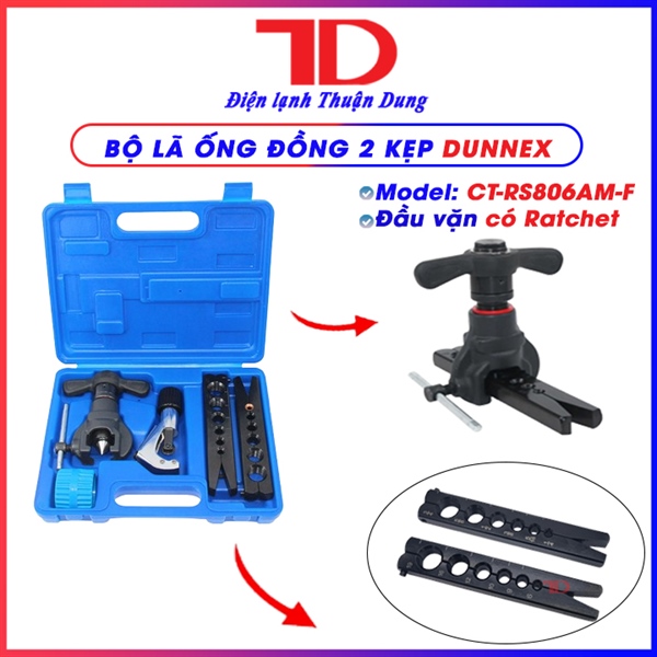 Bộ Loe Ống Đồng lệch tâm 2 Kẹp Dunnex CT-806AM-F, lắc tay, đầu vặn có Ratchet, kèm dao cắt CT-274, dao nạo bavia CT-208, hộp nhựa (thùng 10 bộ)