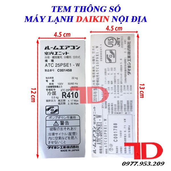 Tem thông số Daikin R410A 25PSE1 (Made in Japan)